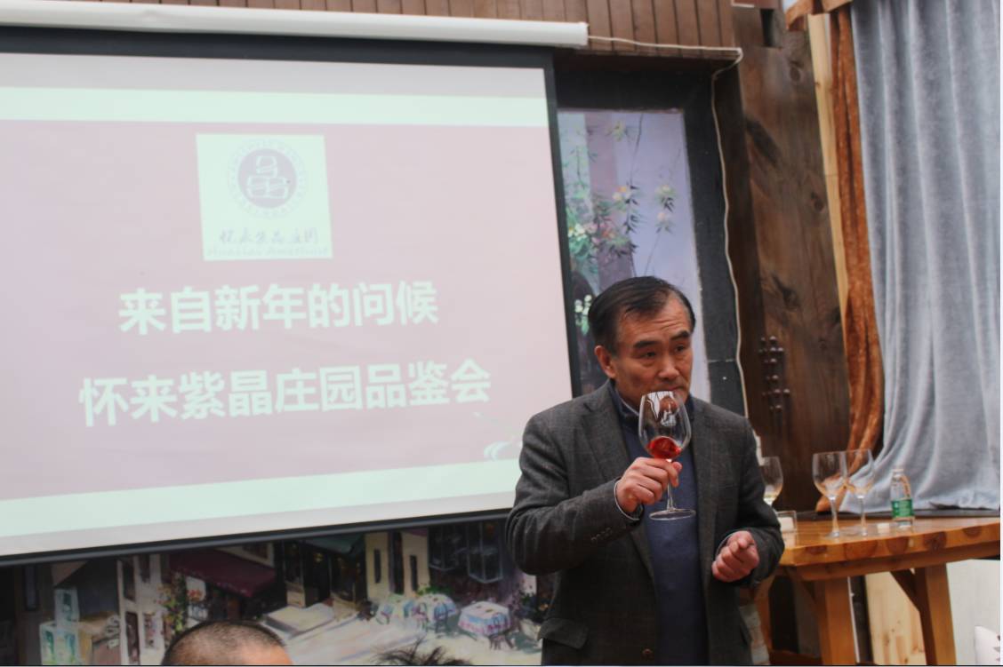 随后,怀来紫晶庄园庄主马树森先生开启了此次品酒会。在介绍酒庄及产区时,马树森先生称,以“专注品质,专注美好生活”为宗旨的怀来紫晶庄园位于河北省怀来县官厅湖南岸, 地处中国优质葡萄酒主产区“黄金地带”——延怀谷地内。紫晶庄园是集葡萄种植、葡萄酒酿造、灌装、销售、私藏酒窖服务以及庄园旅游观光为一体的中外合资企业。庄园占地600亩,规划葡萄园种植面积1500亩,年产葡萄酒1000至1500吨,酿制精品高档葡萄酒300吨。注册商标“丹边”干红、干白葡萄酒,先后在RVF中国优质葡萄酒挑战赛、德国柏林葡萄酒大奖赛、韩国大田第三届亚洲葡萄酒大奖赛、百大葡萄酒评选等重要赛事摘得几十项奖项。