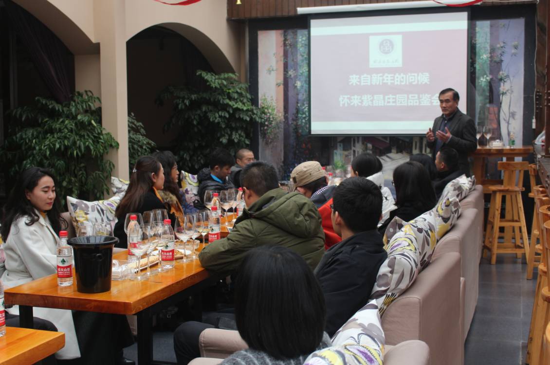 1月6日下午,老米品酒会2017年第一场,由成都市葡萄酒协会支持,河北怀来紫晶庄园、葡萄酒生活订阅号、四川同合文化传播有限公司联合举办的“来自新年的问候——怀来紫晶庄园葡萄酒品鉴会”在成都橡木桶酒窖举行,来自成都各行各业的20位企业家、葡萄酒爱好者和侍酒师、葡萄酒经销商等应邀出席,共同度过了一个美好的下午。