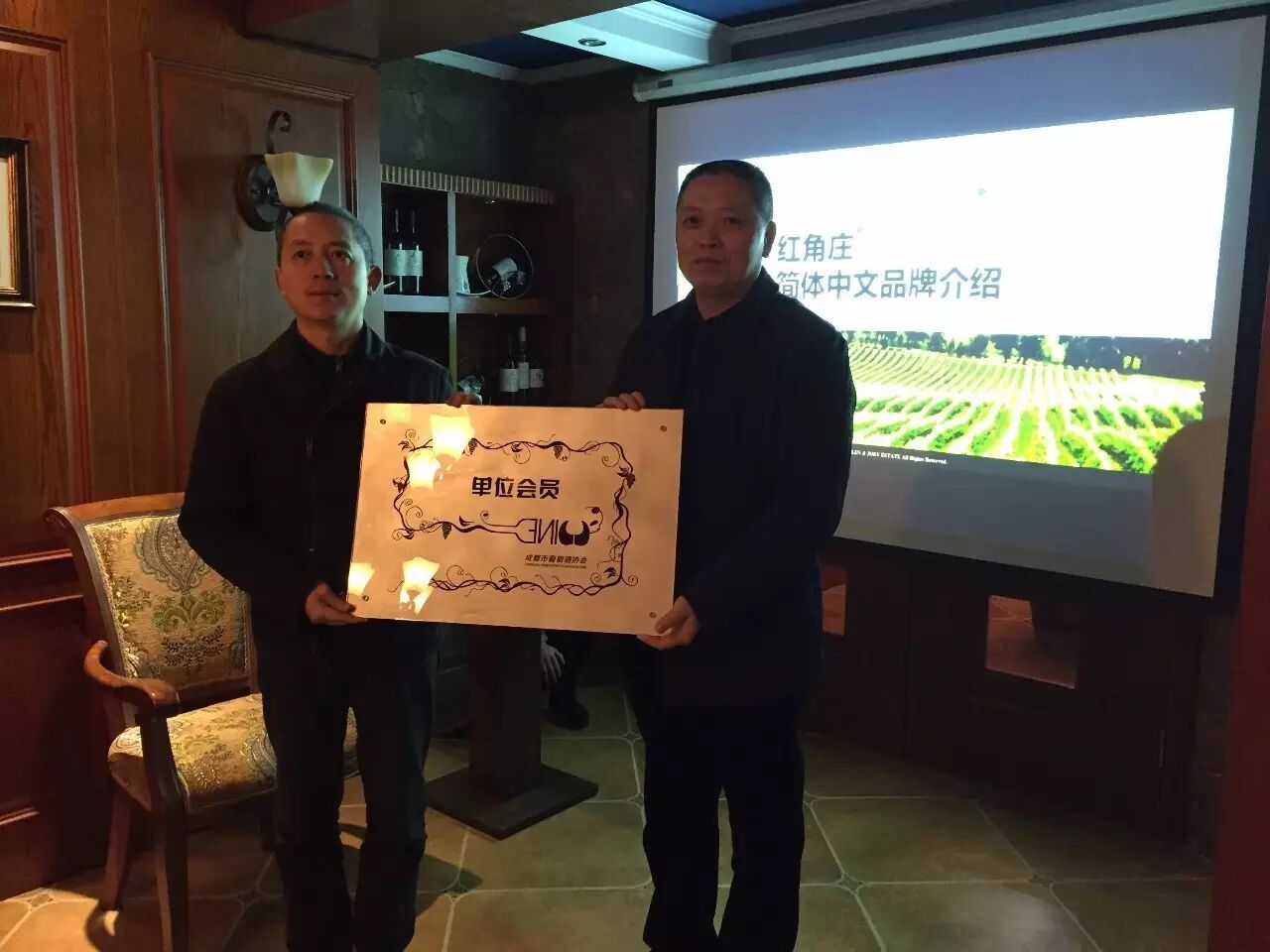 1月11日下午,成都市葡萄酒协会会长周劲松先生、成都市葡萄酒协会秘书长吴忠先生,受邀走访了四川省雅拉红角国际贸易有限公司,参与了当天下午品鉴会,并代表协会为其授予会员单位的荣誉牌。