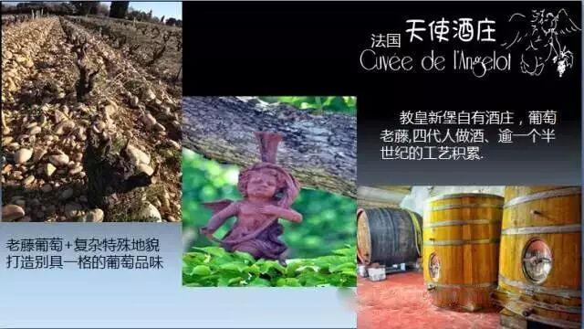 法国天使酒庄(La Cuvée de l’Angelot)位于教皇新堡,是法国南部第二大红酒产区罗讷河谷最高等级的酒庄,14世纪作为皇家酒庄开始酿酒,由教皇命名,每瓶酒均有教皇新堡专用标志,后来变为私有酒庄由家族经营已有四代人了,150多年酿酒史,是属于罗讷河谷一级庄园,年产高端红酒40多万瓶,产品已经畅销全世界45个国家。