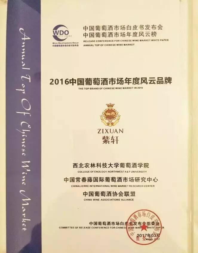 在3月19日下午由中国食品科学技术学会葡萄酒分会、中国葡萄酒协会联盟、西北农林科技大学葡萄酒学院、内蒙古乌海市人民政府、常春藤葡萄酒市场研究机构等单位主办的“中国葡萄酒市场白皮书发布会暨年度风云榜颁奖典礼”上,来自甘肃河西走廊的实力派葡萄酒”紫轩”再度登上中国葡萄酒市场年度风云品牌榜,自2012年起已连续五年榜上有名。