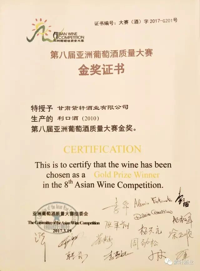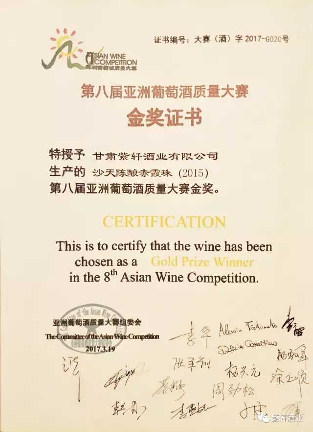 在3月19日下午由中国食品科学技术学会葡萄酒分会、中国葡萄酒协会联盟、西北农林科技大学葡萄酒学院、内蒙古乌海市人民政府、常春藤葡萄酒市场研究机构等单位主办的“第八届亚洲葡萄酒质量大赛颁奖盛典”上,紫轩利口酒、沙天陈酿赤霞珠喜获金奖。