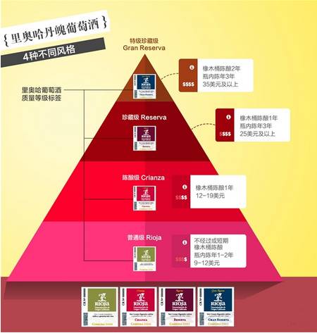 里奥哈陈酿酒指的是那些在橡木桶内陈酿至少一年且在瓶中陈年数月的葡萄酒。而陈酿级的白葡萄酒其橡木桶陈酿的最低时长为6个月。